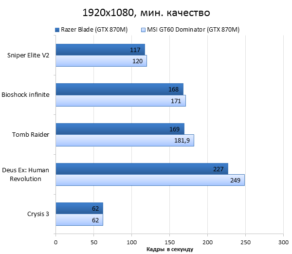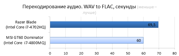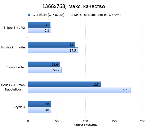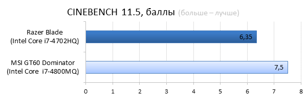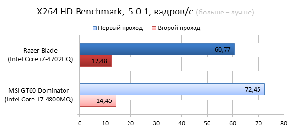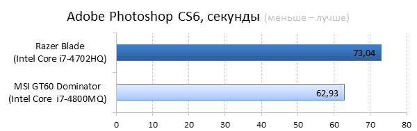 Razer Blade смог держаться довольно близко к своему конкуренту, но обогнать его не сумел. Это можно объяснить частотами процессоров — у ноутбука MSI они выше на целых 500 МГц.