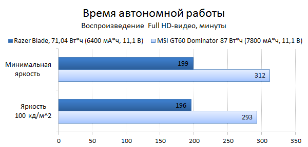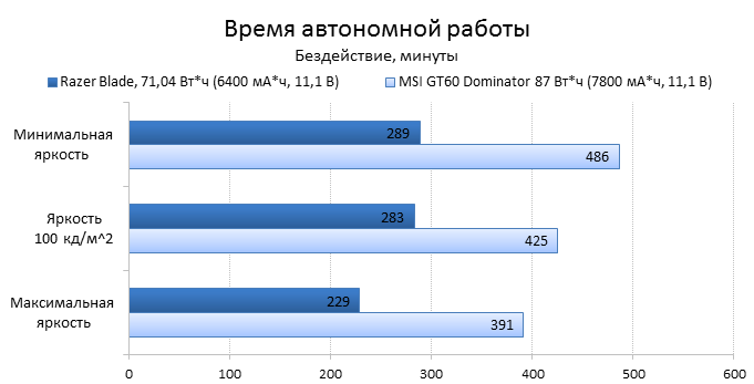 К сожалению, с временем автономной работы «Блэйду» не повезло. Даже при яркости 100 кд/м2 он проработал на два часа меньше, чем его конкурент. Кроме того, минимальная граница яркости дисплея составила 96 кд/м2, поэтому его результаты в тестах с минимальной яркостью и при яркости 100 кд/м2 оказались практически одинаковыми.