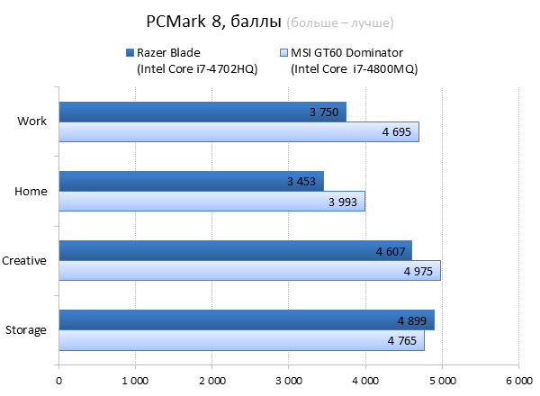 В первых двух субтестах финского бенчмарка PCMark 8 эта история повторилась, но в третьем субтесте, Creative, герой нашей статьи стал догонять своего конкурента, а при тестировании накопителя он смог и вовсе обогнать массив RAID-0, состоящий из двух mSATA SSD. Впрочем, с тестированием накопителей PCMark справляется не очень хорошо — во многих сценариях дисковая подсистема «Доминатора» может на самом деле оказаться быстрее одиночного накопителя «Блейда».