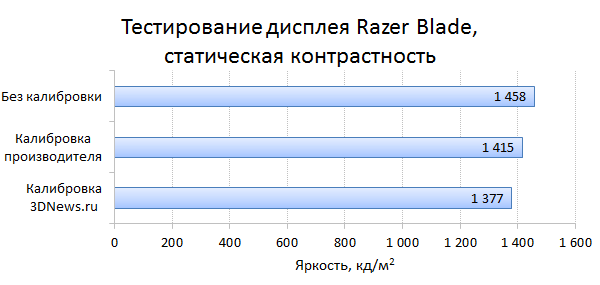 Что касается качества изображения, то здесь нас ждал сюрприз: цветопередача у «Блэйда» оказалась великолепной. Экран Razer Blade можно смело назвать одним из лучших ноутбучных экранов, которые мы встречали в 2014 году. Причём благодарить за это стоит не только и не столько производителя матрицы, сколько саму компанию Razer, которая основательно подошла к качеству изображения и откалибровала экран ноутбука. Для калибровки использовался колориметр X-Rite i1 Display Pro и программный комплекс Argyll CMS v. 1.6.3 с графическим интерфейсом DispcalGUI v. 1.7.5.7 (эту информацию мы почерпнули из цветового профиля экрана ноутбука, который был установлен по умолчанию) — почти тот же набор, который используем мы.