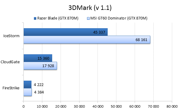 Как обычно, тестирование графики начнётся с синтетического бенчмарка 3DMark 8. По каким-то причинам Razer Blade смог набрать очень мало очков в субтесте IceStorm — подобный результат не характерен для видеокарты уровня GTX 870M. Впрочем, в более «тяжёлых» субтестах CloudGate и FireStrike мы получили нормальные результаты.
