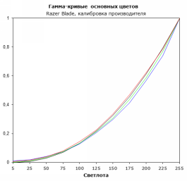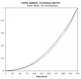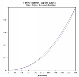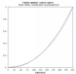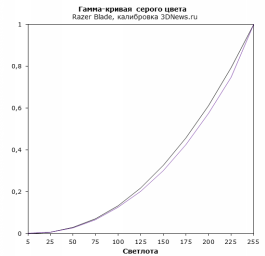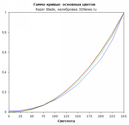 С гаммами всё было неплохо и до калибровки, а Razer смогла еще немного приблизить кривые к эталонной. А вот у нас так не получилось. В целом все три варианта вполне приличные, хотя оптимален именно тот, который выбрали в Razer.