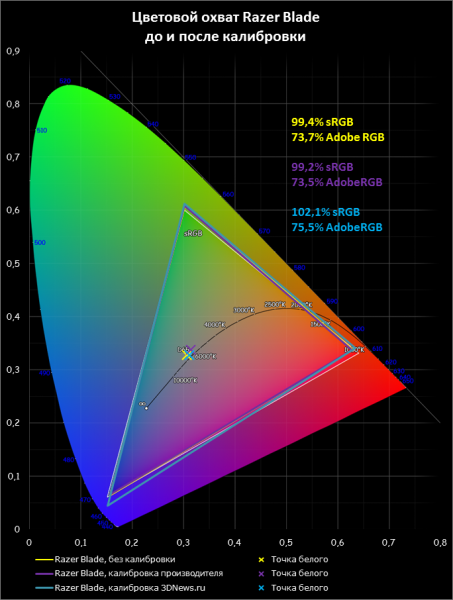 После тестирования экрана мы можем сказать, что в Razer решили не калибровать каждый ноутбук, а сделали один профиль и теперь устанавливают его во все экземпляры Razer Blade. Этот подход неплохо работает, и если ваши задачи ограничиваются просмотром видео и играми — то легчайшее несовершенство «общего» профиля вы абсолютно точно не заметите. Ну а тем, кто хочет заниматься профессиональной обработкой фото, советуем все же откалибровать экран заново, чтобы улучшить его цветопередачу и убрать те небольшие огрехи, которые неизбежно дает «усредненный» профиль от Razer.