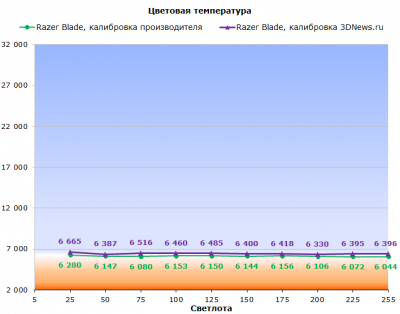 Изначально цветовая температура настроена неидеально — она заметно повышается на оттенках серого средней светлоты. Калибровка Razer устраняет неприятный «горб», но делает температуру чуть более низкой, чем нужно (изображение немного «желтит»). Проведенная нами калибровка позволила приблизить температуру по всему градиенту к более правильному значению 6 500 К — оно соответствует полуденному солнечному освещению.